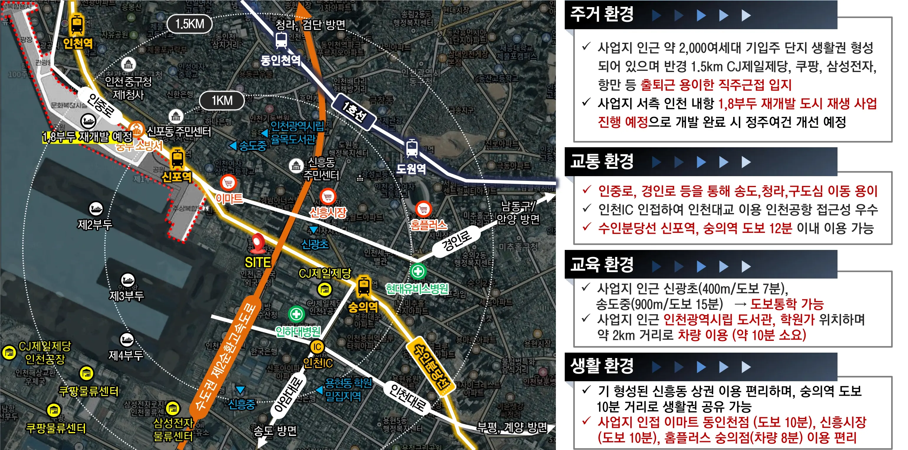약 2,000여세대의 기 입주단지로 형성된 신흥동 생활권 내 위치하며 인근 CJ, 쿠팡, 삼성전자 등 물류센터 출퇴근 용이한 입지